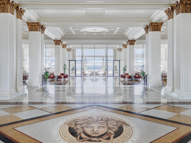 Neoclassical architecture meets elegant regional Arab influences in the building's design. Three pools showcase elaborate mosaics, and landscaped gardens have glorious views of the surreal Dubai skyline. The iconic Versace Medusa head is a constant reminder of the fashion house's influence.